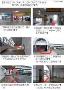 【乗り場案】近鉄鳥羽駅改札を出て、1番出口方面のエレベータで1階へ。降りてすぐ左後方に「かもめバス」のバス停があります。